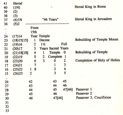 The year of Jesus' first Passover will establish the anchor date for His ministry. This Passover will be the first one following His baptism by John. It has been established that the traditional date of January 6 in 28 CE was a likely date for His baptism. The following first Passover would then have been March 29, 28 CE. Can this date be supported by evidence independent of previous or following events? There is only one passage that may help to identify specifically the year of the first Passover of Jesus' ministry, and that refers to there having been forty-six years since the Temple was begun. Additionally, it is possible to limit the range of possible years of this Passover from 28 to 31. The earliest year of Jesus' first Passover was the first one that followed His baptism. His baptism is presumed to have followed shortly after John the Baptist began his ministry during the fifteenth year of Tiberius, "when Pontius Pilate was governor of Judea." (Luke 3:1) The earliest date of the fifteenth year of Tiberius according to Luke began October 20, 27, and Pontius Pilate arrived in Judea about that time. Therefore, the earliest possible first Passover was the one following the arrival of Pilate, or in 28 CE. The latest possible first Passover can be inferred from the year in which the main Temple area was completed. At Jesus' first Passover the Jews spoke as though the Temple were still being rebuilt. This was before the main Temple complex was completed in late 30. This is determined by the completion of the Hanuyot colonnade, which is in the Temple precincts, most likely the Royal Portico. Then the Sanhedrin was transferred to there from the Lishkat Hagazit, "Chamber of Hewn Stone." This occurred, according to Talmudic sources, forty years before the destruction of the Temple in 70 CE (Sanhedrin 41:2; Abodah-Zarah 8:2). The Temple was destroyed on Ab 9, or August 5, 70. The reckoning of this date is according to the Diaspora calendar that began the year in the fall month of Tishri. By counting back forty years the Temple would have been completed in the year beginning in the fall of 30 CE. The final completion of the entire Temple mount occurred during the administration of the Roman governor Albinus (62-64 CE) when "the temple was finished." (Ant. XX 9:7) Thus, if the completion of the main Temple complex limits the Jews' reference to forty-six years, then the latest first Passover of Jesus' ministry would likely be in 31. The first Passover of Jesus' ministry is thus limited to the years 28, 29, 30 or 31. During Jesus' first Passover the Jews asked for a sign, and He responded, "`Destroy this temple, and in three days I will raise it up.' The Jews therefore said, `It took forty-six years to build this temple, and will You raise it up in three days?' But He was speaking of the temple of His body." (John 2:19-21) These passages are the only scriptural clue to independently establishing the year of Jesus' first Passover. What did Jesus mean by "temple," how did the Jews interpret His meaning, and what did the Jews mean by "temple?" Understanding each perspective will help to decide the probable starting point of the forty-six years. Then, there is the problem of interpreting the claim of uninspired bystanders that it took forty-six years to build the Temple. Their words are truly reported, but are they speaking truly? Jesus referred to His own body as naos, a temple or shrine. He was standing in the Court of the Gentiles, near the front of the main Temple. The Jews thought He was referring to that structure, not His body. They thought Jesus was saying that if that Temple were destroyed, He would build it again in three days. They responded to Jesus with His same word, naos, which they claimed had taken forty-six years to build. They confronted Jesus with the impossibility of rebuilding in three days what had taken forty-six years to build. The Jews knew when the Temple had been begun, and they took spiritual and psychological refuge in that knowledge. Jesus had just driven from the Temple the merchants of sheep and oxen and the moneychangers. He then confronted those selling the doves, and He was then asked by the "Jews" to show a sign. This was probably asked by a Temple scribe and echoed by the crowd that must have gathered. The claim of forty-six years to rebuild the Temple also must have been validated by the crowd. They contrasted the building process of three days against forty-six years and are not likely to have minimized their argument by exaggerating. Under these circumstances the forty-six years should represent a reliable number of years "to build this temple." The approximate month and year in which the rebuilding of the Temple was begun can be established from the history of Josephus. He wrote, "now Herod, in the eighteenth year of his reign, and after the acts already mentioned, undertook a very great work, that is, to build of himself the temple of God." (Ant. XV 11:1) Josephus also gave the fifteenth year, (Wars I 21:1) which probably refers to the year in which Herod began the rebuilding of the Temple mount, not the Holy of Holies. According to Josephus the eighteenth year from Herod beginning his rule in Jerusalem would have begun Nisan 1, 20 BCE. This was "after the acts already mentioned," one act being "when Herod had already reigned seventeen years, Caesar came into Syria." (Ant. XV 10:3) This implies that near the end of his seventeenth year, early 20 BCE, that Augustus visited Syria. This is confirmed by Dio Cassius (Roman History LIV 7:4-6). Also, Josephus said that Augustus visited Syria ten years after his first visit, which was in 30 BCE (Wars I 21:1). When, in Herod's eighteenth year, beginning Nisan of 20 BCE, was the Temple begun? Herod, in a public speech, announced his intention to rebuild the Temple. He promised not to begin the actual rebuilding process until everything was prepared. This included "a thousand wagons, that were to bring stones for the 